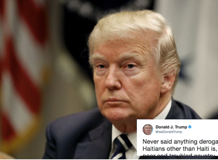 At this point in his presidency, President Donald Trump has already said enough things that have offended people that it's tough to call what will happen next. And yet, here we are. On Friday morning, Trump seemingly denied calling Haiti and Africa "sh*thole" countries, after The Washington Post claimed he had made the remark during a meeting in which he rejected a Deferred Action for Childhood Arrivals (DACA) program deal. But not only did many on social media seriously doubt his comment, they also found his explanation to be seriously troubling. (Romper reached out to the White House for comment, but did not hear back at the time of publication.)