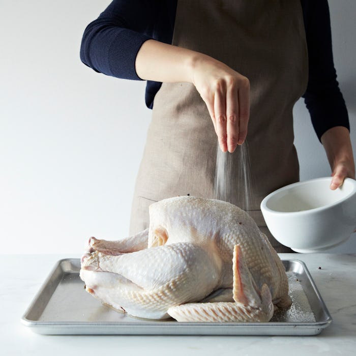 If you can't thaw the turkey in the refrigerator (maybe you don't have enough space in there, or maybe you just don't have as much time as you'd like), try this instead: keep the bird in its original wrapping and let it sit in a big container that's filled with cold tap water. Change the water every 20 to 30 minutes, or whenever the water's temperature gets between 40 and 45 degrees fahrenheit. You'll know you're done thawing when a thermometer says that every part of the bird is about 40 to 45 degrees fahrenheit.