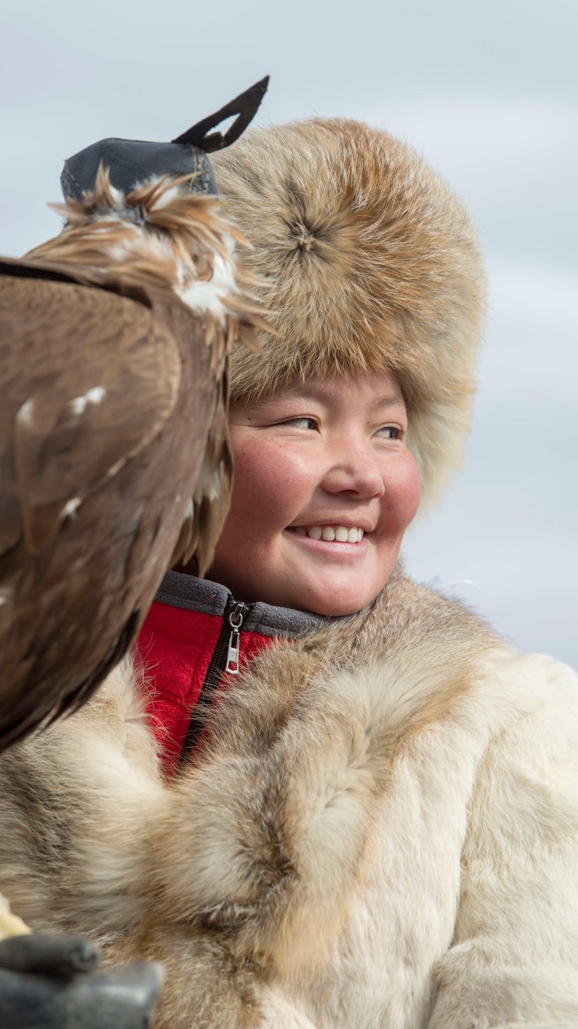 Here, the 2014 winner of a Mongolian "Golden Eagle Festival" poses with her bird that she has trained to hunt and kill, and looks like she's having a damn nice time doing it.
