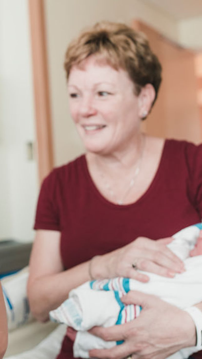 A grandparent eagerly shows off her grandchild in this photo, taken by Crow Birth. The baby is in the center of the shot, with grandma holding them up from the left. Her hand supports the baby's delicate neck, and she sports an excited expression, looking at someone across from her.