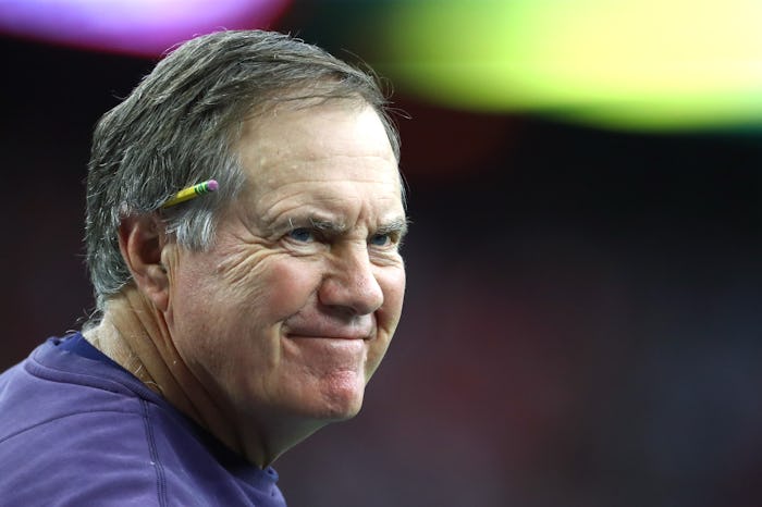 Belichick has been the team's head coach since 2000, according to CNN, and has spent 42 years as a coach in the NFL. This year's Super Bowl is actually the seventh time Belichick has appeared at the Super Bowl with the Patriots — and with star quarterback, Tom Brady. That's a pretty big feat to be sure, but even though he must be excited that his team has made it this far, you wouldn't really know it by looking at his face. Whether he realizes it or not, Belichick's semi-angry facial expressions have pretty much made him the NFL's own version of Grumpy Cat, and honestly, it's kind of awesome. As with all meme-able moments, Twitter users haven't let Belichick's super-unimpressed reaction slide, and the results have been hilarious.