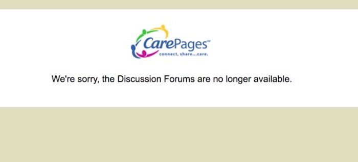Many heartbroken families believe they weren't informed by CarePages that their information wouldn't be available to them as of December 31, and in fact, if you visit the site now, the holding page informs visitors: We're sorry, the Discussion Forums are no longer available. Likewise, an automated response to an email sent to the company read, "Please note that CarePages will be accessible until December 31, 2017."