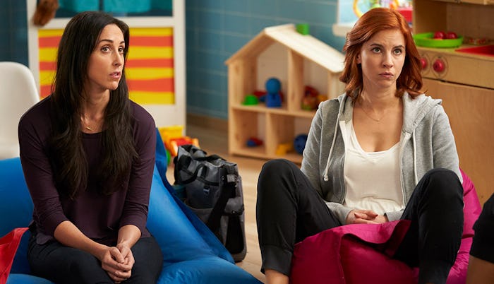 Three years later, Workin' Moms is ready for an entirely new audience thanks to Netflix: the rest of the world. The series, which could definitely be considered a black comedy, addresses several different topics that, unfortunately, society is still struggling to normalize. For example, postpartum is at the forefront with Frankie, a lesbian mom and real estate agent who can't seem to shake the dark cloud hovering over her at all times. Then there are Kate and Jenny, both of whom are forced to pump breastmilk at work in less than ideal conditions — like a public bathroom toilet stall, for one. Lastly there's Anne, who on the outside seems to have it all but is struggling with a third unexpected pregnancy while her second child is still just under a year old.