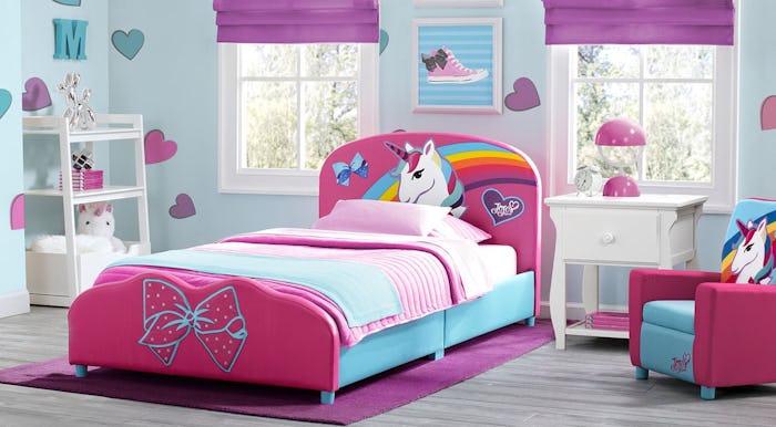 The Batman bedroom set is so cool, I almost want it for our master bedroom. Let’s face it, my husband would probably be down since Batman is his favorite superhero. But you can customize the dresser drawer and nightstand to be white, gray, or dark brown, and it comes with a memory foam twin mattress, twin sheet set, a storage bench, an official Batman twin bed that has the coolest graphic on the foot of the bed, and even a Batman area rug. There’s even a Justice League set for fans of all the DC superheroes. For Marvel fans, in addition to the Spiderman set, there’s an Avenger’s set, too. And as for the other sets, I totally thought the JoJo Siwa set was Lisa Frank — it's that amazing.