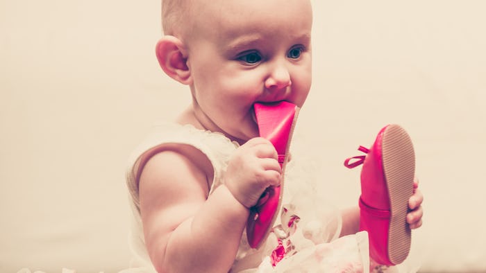 Dr. Natasha Beck, a clinical psychologist who specializes in neuropsychology, says the earlier you expose your baby to shoes, the better. “Providing children with repetition and consistency is key to most things, as that provides comfort and a general sense of expectation for them,” she tells Romper in an email interview. So when exactly should you start to introduce your baby to shoes? Beck says, “Anywhere between 3 to 6 months is best to start, but they should be soft sole shoes. The idea of wearing shoes at this age is just exposure, not having them stand up or trying to walk.” Beck also adds that the explanation of wearing shoes is also important. “Telling your baby, ‘we are putting our shoes on to protect our feet when we leave our home,’ is important to say every time you put shoes on. Also narrating to your baby when you put your shoes on helps model to your baby that you put shoes on too when going out.