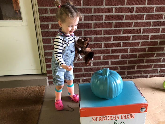 The night before, my husband, Claire and I had painted our own teal pumpkin, a gesture we decided would not only be a signal to kids that they could safely trick-or-treat at our house, but that they live in a neighborhood that supports them. Claire and I had plans to put teal gems on it after breakfast.