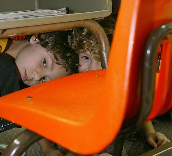 Lead image: Kindergarten students hide under their desks during a classroom lockdown drill February 18, 2003 in Oahu, Hawaii. (Photo by Phil Mislinski/Getty Images)