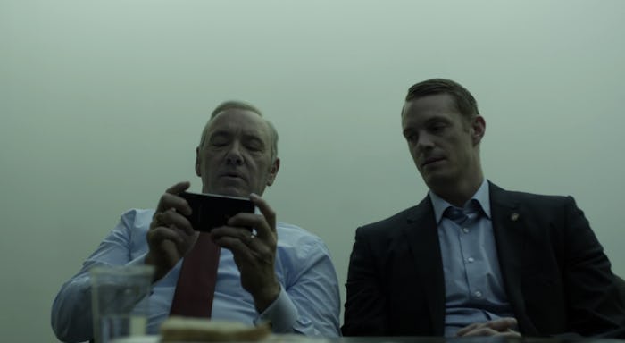 And of course, Frank calls his bluff. The President invites him to discuss the ICO crisis, but instead they play Agar.iO on Conway's phone. It works out well for all of us because we get this tender moment between these two men who have stripped off a layer (in Underwood's case, his shoes) to be who they really are together. Just two dudes playing a game — Conway watching over Frank's shoulder as he tries not to get eaten. A metaphor, most definitely.