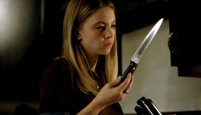The preview for the movie hints at all the dark depths it gets to after Sydney Sweeney's Danica shows up out of the blue to take part in some mother-daughter bonding with Cindy Busby's Kate. First it's just innocent lurking behind the door of the fridge with gigantic Margaret Keane eyes, startling Kate as she gets what I can only assume is a delicious snack, but it graduates to more sinister territory from there. Soon Danica is contemplating knives ominously, destroying the landscape work Kate likely paid a pretty penny for, and holding Kate's real birth daughter hostage.