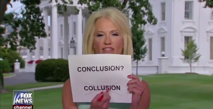 To be fair, maybe she deserved to get turned into a meme, since she basically implied that anyone who's suspicious of the Trump administration's Russian ties is about as intelligent as a 3-year-old. "This is to help all the people at home," she told host Sean Hannity as she held up a visual aid. "What's the conclusion? Collusion? No. We don't have that yet," she said while crossing out the second word (side note: "yet"?). Then, another sheet: "I see illusion and delusion. So, just so we're clear, everyone. Four words: Conclusion? Collusion. No. Illusion. Delusion. Yes. I just thought we would have some fun with words. Sesame's Grover word of the day," she concluded while spitting on Jim Henson's grave. Go ahead and watch it if you like clenching your jaw so hard that you develop microfractures in your teeth.