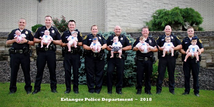 It's a pretty significant population boost for the small town of Erlanger, located 20 minutes south of Cincinnati, Ohio, as well as a bit of a staffing nightmare. "We are all like, 'Oh, I am having a kid,' then we are like, 'So am I.' 'So am I.' A couple months later, 'So am I,'" Officer Ryan Atchley told local NBC affiliate WLWT. "Then you start looking at it and say, '[The] schedule is going to be an issue.'" He's one of the seven new dads on the force, along with Officers Robert Yocum, Michael Clark, Kyle Thornberry, Justin Auton, EJ Dettmer and Josh Nezi. Atchley also acknowledged the comparatively tougher challenge for Officer Margaret Ernst. "She is not only having the kid, she is doing this job also."