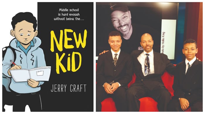 We have all felt on the outer at some point, but what if there is a racial component to that feeling? Jerry Craft's New Kid (Harper Collins, February 2019) explores that space, based on the Harlem-born artist's own teen years as a Black student at an elite — and mostly white — private school. Interspersed in with Craft's own struggles are the experiences of his two adult sons, who went to an equally prestigious and culturally homogenous private school in Connecticut — the after-effects of that isolation can last decades, Crafts tells Romper.