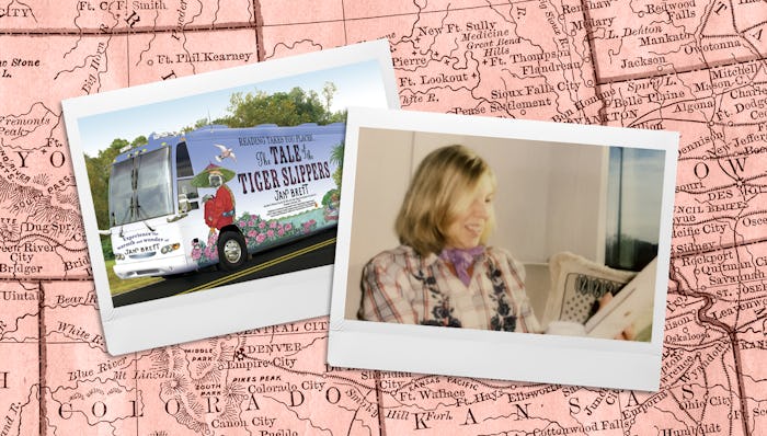 The vehicle formerly known as Kid Rock’s “Red Blooded Rock 'n' Roll Redneck Extravaganza” tour bus is rumbling along the interstate as Greg mans the steering wheel and Jan Brett takes a nap in the rear berth. The Prevost X3-45’s jet black exterior has been upholstered in a soft blue wrap decorated with smiling tigers in silk robes; the inside has been furnished with needlepoint throw pillows and rooster crockery from Brett’s home. We are less on the highway to hell and more on the highway to coffee and a biscuit: The Tale Of The Tiger Slippers tour is making its way from a strip mall on Long Island to a high school auditorium in Pennsylvania in late November. At 3:30 p.m., the light is flat on the tussocks of western New Jersey, and the sun is already getting ready to set. “Jan’s having a great nap,” Joe Hearne, Brett’s husband of 39 years, says to the publicist. He’s pleased for her.