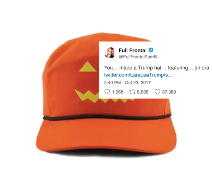 The internet onslaught began when Lara Trump, Eric Trump's wife and the president's daughter-in-law, posted a photo to Twitter of herself clad in the orange hat in front of a giant portrait of Trump himself. Along with the hashtag #MakeHalloweenGreatAgain (but when was Halloween anything less than great, I ask), she urges followers to order their very own hat today. While it was most likely an attempt to show her support for Trump merchandise, the tweet sparked a series of tweets that were far from supportive.