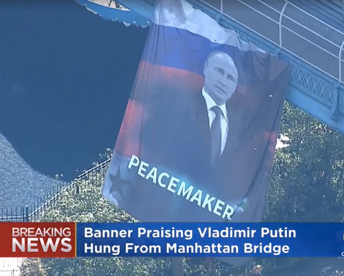 Brooklyn was subject to quite the view this Thursday afternoon as a 20 by 30 foot banner featuring a photo of Vladimir Putin was unfurled in a decidedly conspicuous location. Sporting a stern photo of the Russian president, the banner bore the sole slogan "PEACEMAKER." The rest of the banner presents Putin in front of a Syrian flag as well as a Russian flag. Immediately following the unveiling, varied reactions to the Putin banner on the Manhattan Bridge showed that patrons of the internet have some similar theories as to how all of this came about, as well as who might have been involved in carrying out such a sneaky yet public act.