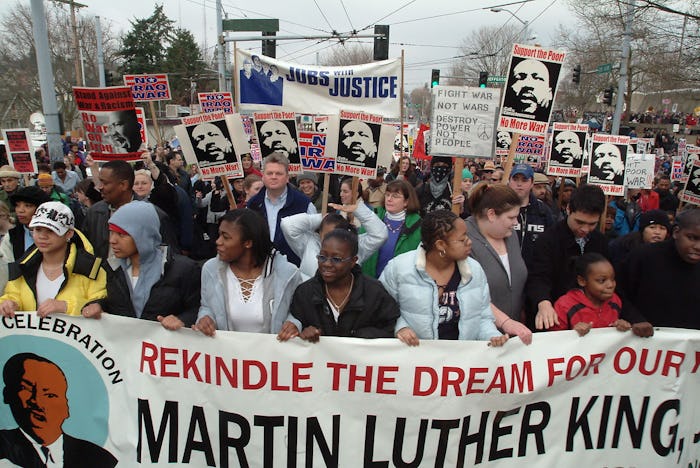Monday, Martin Luther King Jr. Day, is meant to be a day to celebrate progress. It’s meant to be a day to think about the man who has become one of the most beloved figures of the Civil Rights Movement and to celebrate his bravery and vision. But 30 years after Martin Luther King Jr. Day became a recognized holiday in America, people are still conflicted. Because as much as King is admired — as much as he is hailed as a hero worthy of a day named in his honor — when it comes to the rampant racism that continues to occur right before our eyes, people seem to be forgetting his message. The hashtag, #ReclaimMLK, reminds people of King's message while pointing out the hypocrisy of not acting on or supporting Black Lives Matter and other current civil rights campaigns.