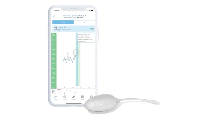 There are two components to OvuSense (which costs $129 for a starter pack with a two month subscription, or $299 if you want the device plus a yearlong subscription). First, there's a wearable monitor that you insert like a tampon and keep in overnight. It takes your core temperature every five minutes as you sleep. When you wake up, you simply take it out, wash it, and upload your data to an app, where it's stored in a secure cloud database. All that information lets OvuSense predict when you're going to ovulate, and the company says the device is 99% accurate.