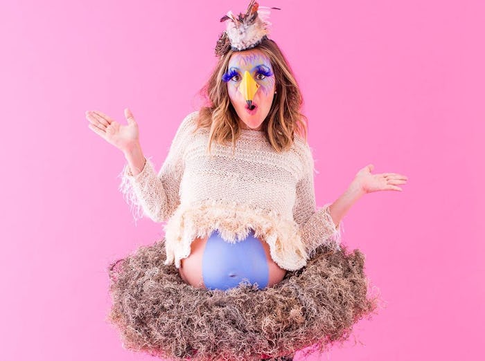 Brit + Co shared this unique, clever, and absolutely stunning DIY bird's nest maternity costume that's – no surprise – super popular on Pinterest. With your belly as the bird's egg, and your upper body and face as the bird, the costume gives the illusion you're sitting on an egg with a tutu type skirt as the bird's nest. Of course, your legs can serve as the tree trunk, and you've officially completed one of the most clever maternity Halloween costumes out there, in my opinion. Check the pin out here to save it to your Halloween board!