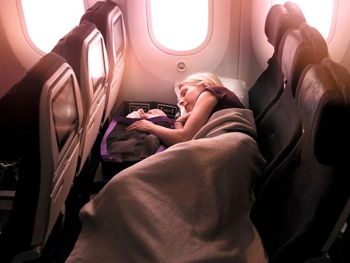 Air New Zealand's "Skycouch" — a row of three economy seats that can be turned into a flat surface — already allows children to lie down while the plane is cruising (parents need to have infants on their lap for takeoff and landing currently), but proposed changes to the set up will make flying even better, as reported by the Mirror. The new Skycouch design offers an infant harness and belt that allows children to lie down for the entire flight, including takeoff and landing, and for two children to lie side by side, buckled in. Another option, the "infant pod," provides a secure, cozy place for the baby to travel close to their parents. These options free parents from the stress of bouncing a baby on their knees for hours at a time and allow babies to come out of their carseats, facilitating the elusive airplane sleep that most parents in transit only dream of.