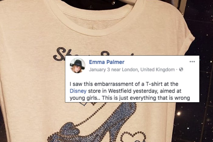 Children are like sponges — they can absorb anything and everything they hear or see. So, it isn't a surprise that most parents find it important to surround their children with positive and empowering messages. And Disney films have been promoting the message that dreams come true for decades (which is a reason why kids love these films so much). But one mom, Emma Palmer, from the United Kingdom is furious over a Disney T-shirt for sending the "wrong" message to young girls. Romper's request for comment from both Disney and Palmer was not immediately returned.