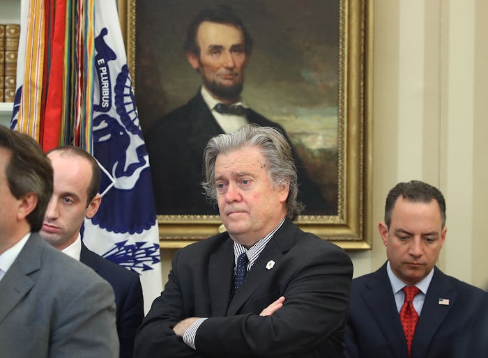 For all the controversy and speculation over White House Chief Strategist Steve Bannon's role in the Trump administration, tangible details about what he's actually doing have remained somewhat scarce. But a new photo shared on social media Tuesday has unintentionally provided the public with insight into Bannon's priorities – and unsurprisingly, it's pretty unsettling. According to CNN, it has been previously reported that the former Breitbart head installed giant whiteboards on the walls of his White House office, and that he used them to list campaign promises and legislative accomplishments. But this photo of Steve Bannon's whiteboard to-do list is visual proof not only that the boards really do exist, but that they are full of items that likely won't sit well with many American voters.