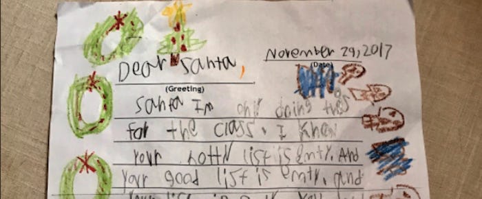Look, 2017 has been rough on all of us. It makes sense that some people are having trouble throwing themselves whole-heartedly into the holiday season. But if you've yet to summon up any Christmas cheer, you need to read this 6-year-old skeptic's letter to Santa. Good lord, will it make you believe in magic — at least that particular magic that happens when a kid inadvertently creates a more perfect piece of comedy than an adult ever could.