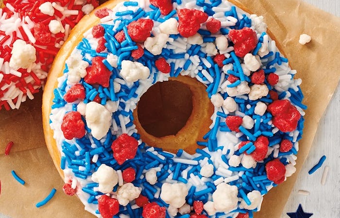 Each donut celebrates their respective country’s holidays with different color themes: the “Independence Day Fireworks Donut” is red, white, and blue, with vanilla fondant, sprinkles, and popping candy. The “Canada Day Fireworks Donut” is red and white, with vanilla fondant, sprinkles, and popping candy.