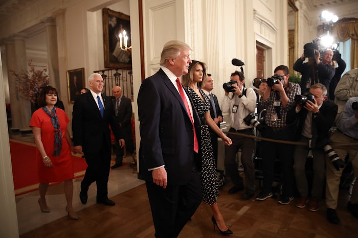 After news broke late Thursday evening that the United States had launched some 50-60 Tomahawk cruise missiles against a Syrian air base near Homs, the White House issued a statement with President Donald Trump's official response to the military action. "Tonight I ordered an airstrike," the president confirmed to reporters at his Mar-a-Lago estate in Florida, where he, the first lady, and adviser and son-in-law Jared Kushner were busy entertaining Chinese President Xi Jinping and his wife, Peng Liyuan. The president cited the recent chemical attack in the country's northwestern Idlib Province, which left scores of people — including dozens of children —dead, as the tipping point behind the strike.