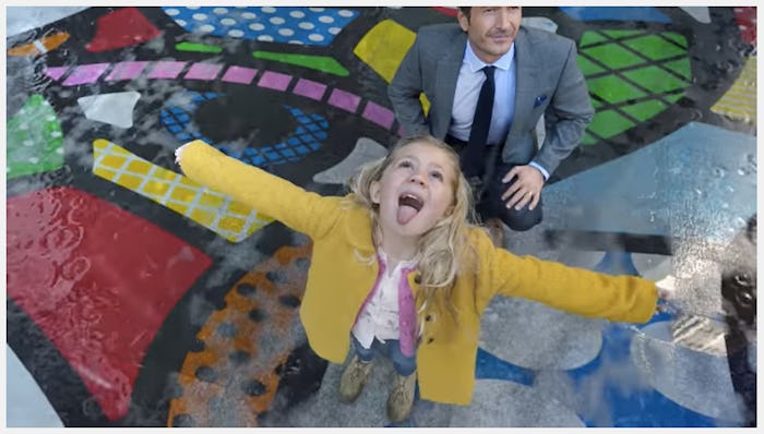Featuring a revamped version of Legend's "Love Me Now," the unfurling splendor of a rainbow world matches the lyrics perfectly. "When I open up my eyes, inspiration all around. I feel so alive and I know it in my heart, something magical is about to start," Legend sings, while a father and daughter, an older couple, and a group of young friends all notice the world around them changing. Sun showers coat sidewalks, flowers, cars, and umbrellas, so that suddenly the entire city is covered in abstract patterns. The commercial ends as "Art makes life #MoreInspired" flashes across the screen, followed by an image of the company's three, differently patterned bottles. Seeing as the ad was directed by Robert Stromberg, who directed Maleficent and served as Production Designer on The BFG, Alice in Wonderland, and Avatar, it's no wonder that the commercial is so captivating.