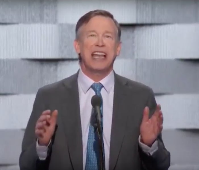 Just hours before Hillary Clinton was slated to formally accept her party's presidential nomination on the closing evening of the Democratic National Convention, one governor took the stage to talk about invigorating the economy and job creation. Despite the honor, though, there's one job that he didn't get: Colorado Gov. John Hickenlooper was reportedly on Clinton's VP shortlist — and it's a position he recently told a CBS affiliate in Denver that he would not have refused. Virginia Sen. Tim Kaine instead snagged that responsibility, but Hickenlooper still turned out at the DNC to support Clinton and his party — and, of course, to lambast Republican nominee Donald Trump.