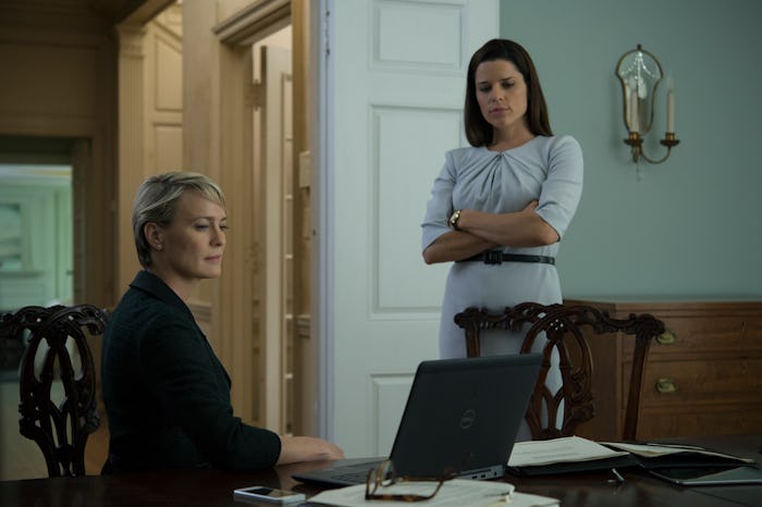 It's to be expected that a new season of any show will bring along with it a new band of characters, but I was pretty surprised to hear that Neve Campbell was joining the roster for Season 4 of one of my own personal favorites. When the announcement was first made that Neve Campbell's character, Leann Harvey, on House of Cards would be a for-real thing, I was pretty pumped. A badass survivor from Scream now shacking up with Frank and Claire Underwood full-time? It sounded all too good to be true. And yet, here we are. (Spoilers for Season 4, Episode 1 of House of Cards.)