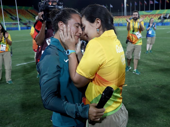 Monday was a historic day all around for 25-year-old Isabella Cerullo. She plays for the Brazilian women's rugby team and her team narrowly missed making it to the finals at the Rio Olympics (the Brazilian team placed ninth in the rugby sevens competition); this was the first time in history a women's rugby team competed in the Olympics at all, so already pretty impressive, right? Then her girlfriend, 28-year-old Deodora stadium manager Marjorie Enya, decided to give "the love of her life" another opportunity to become part of history: she proposed to Cerullo on the rugby pitch after the Brazilian team lost to Australia. This was the first marriage proposal at the Rio Olympics... and just get ready, guys. It's a beautiful thing.