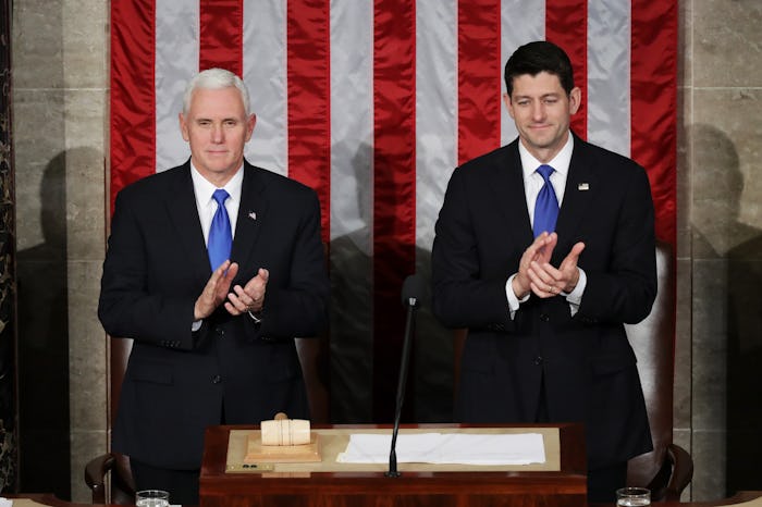 President Trump addressed both the House and the Senate on Feb. 28 for the first time since taking over the White House just over a month ago, but surprisingly, it wasn't his message that got people talking. It was the two dudes behind him. Right from the get-go, everyone wondered, well, the obvious: Why are Mike Pence and Paul Ryan wearing blue ties? Are they trying to match? Did they plan this? Have we all been propelled so far backwards into the depths of history that we're recreating all the times in high school where we subtly told our best friends to match us without like, you know, actually saying they planned to match with us?