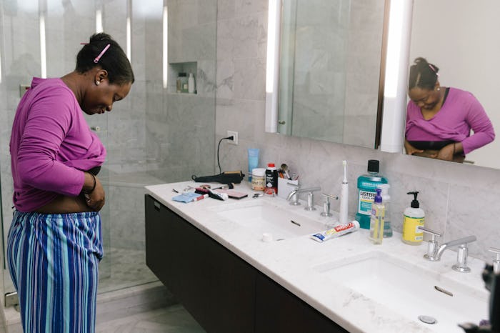 According to The American College of Obstetricians and Gynecologists (ACOG), there's a variety of skin conditions you might experience during pregnancy, including the inevitable stretching of the stomach — navel and all. Just as you're likely to get stretch marks from your skin growing to accommodate your ever-expanding belly, your navel is likely to change shape, tingle, itch, or stick out when you're pregnant. These navel changes happen as the result of, quite simply, the stretching of your stomach. There may be slight pain or discomfort as the muscles and ligaments grow to support your enlarged uterus, too. And speaking of the navel area, along with the stereotypical stretch marks, you might also notice the linea nigra, which The American Pregnancy Association (APA) describes as a dark line that runs from the navel down the belly. It's usually temporary, disappearing sometime after delivery, but it can be a little, well, surprising.