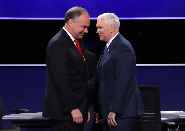 At the first presidential debate in September, Democratic candidate Hillary Clinton stepped out on stage in a blazing red power suit while Republican candidate Donald Trump wore his signature look of a black suit and white shirt — but donned a blue tie, departing from his usual red tie. At the vice presidential debate, it seems as though Kaine and Pence have done the same party color switcheroo — and it turns out, there's a ton of psychology at work here, too.