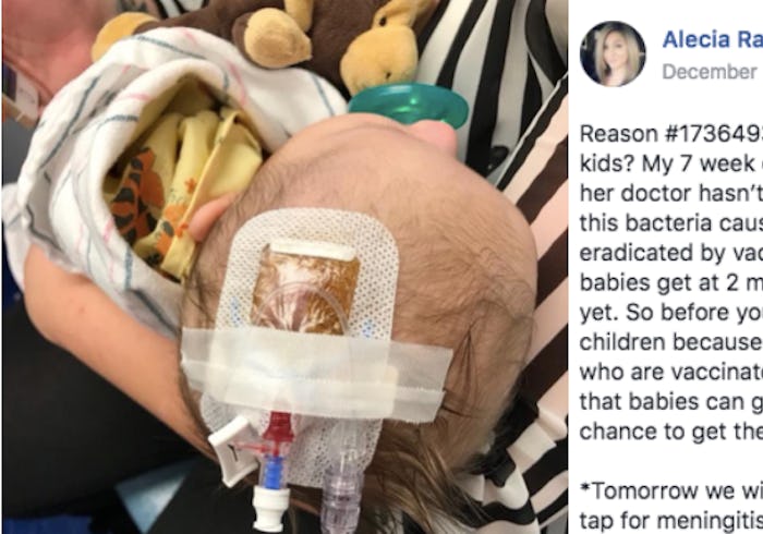 Despite the fact that the American Academy of Pediatrics (AAP) recommends a set schedule of vaccinations — and the majority of school systems also require kids to be up-to-date on these shots — many parents still choose to leave their children unvaccinated. What these anti-vax caregivers might not understand is this decision not only affects their kids, but it can also impact others who are too young to be fully vaccinated. That's appears to be exactly what happened to one infant who wound up with a rare and dangerous bacterial infection. And this heartbreaking photo of a 7-week-old with Hib flu, shared by her aunt, shows just how important vaccinating really is.