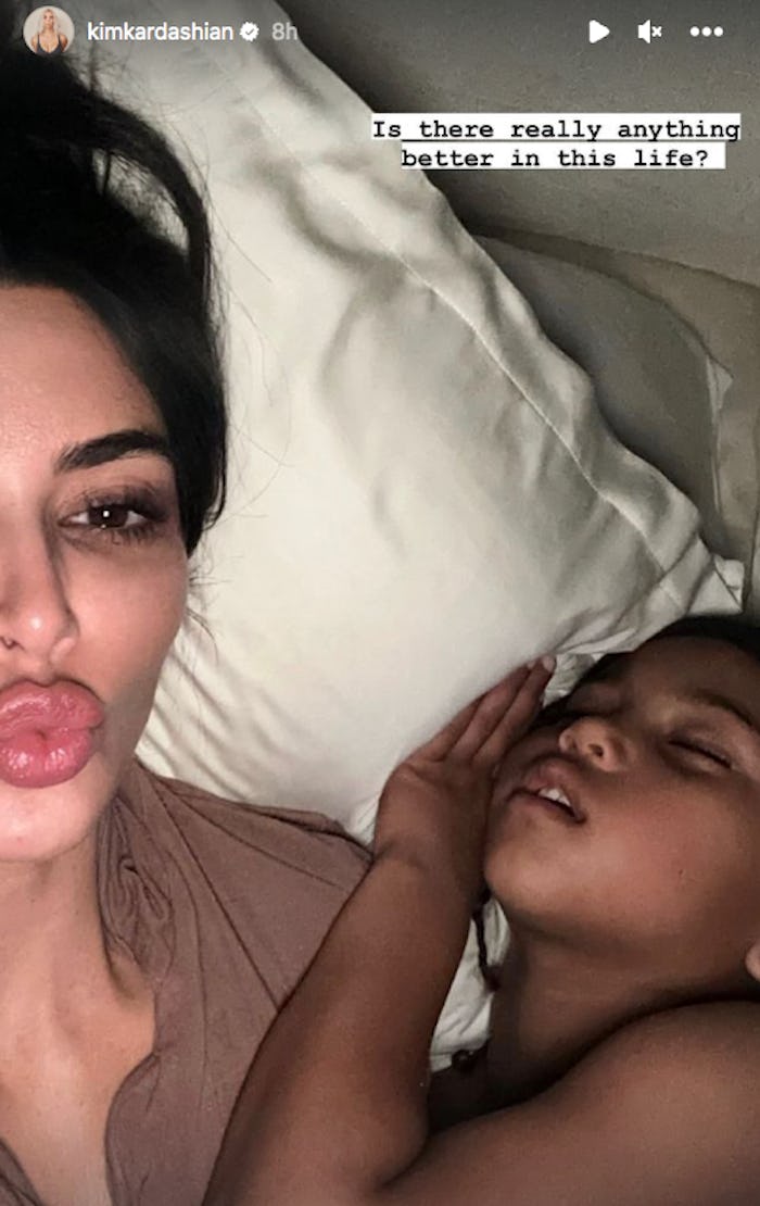 Kardashian shared a series of selfies of her and the 7 year old, her second child with ex-husband Ye (formerly known as Kanye West) in her Instagram Stories. Saint lies sleeping beside her as she purses her lips. In the second photo, very similar to the first, she writes “Is there really anything better in this life?” And, OMG Kim: no! We feel you! Snuggling a sleeping baby after a long day? Especially when that baby is older and you don’t always get to do it like you did when they were itty bitty? It’s the best!