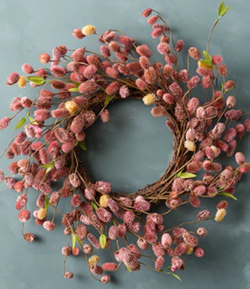 Flowers are nice, but blooms that last all year and double as decor are even better. This wreath, made of dried natural platycarya, is a beautiful pink color with slightly wild blooms so it looks bohemian and delicate rather than overly frilly.