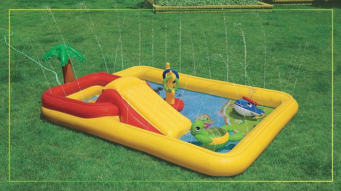 If your kiddos have the energy to burn, they'll have a blast with this slide kiddie pool. This inflatable pool has a small pool and a larger wading pool connected by a slide, and it comes with an inflatable palm tree and sprinklers on the side of the larger pool. Attach the pool to a hose, turn on your water, and your kids will have everything they need to splash around.