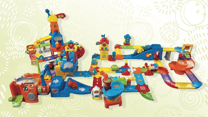 For more bells and whistles, this VTech train set — with a singing motorized train — is certainly going to entertain your toddler. The highly rated set with over 1,400 reviews includes a train station, bridge and tunnel, a hill with a conveyor belt, and — and this especially great — at 10 points along the 32-piece track, it will play phrases, music, or other sound and light effects. You can also add on train cars that work at these "smart points" as well.