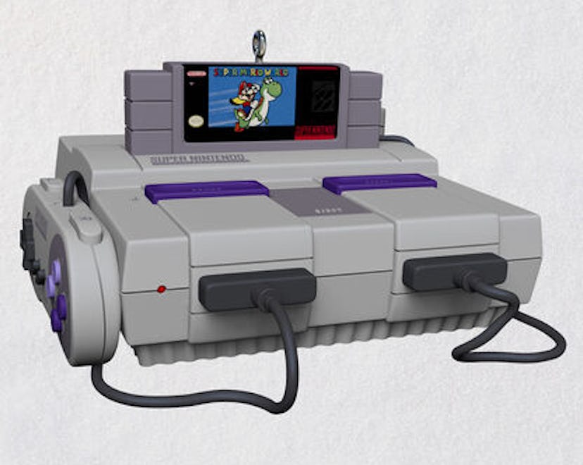 Another video game classic — the Super Nintendo. This adorable ornament looks super realistic with the controller wires, and even the cartridge of the Super Mario World game. Press the button and you’ll be transported back to that beanbag chair in your room sitting in front of the TV playing Super Mario with the lights and sounds from the game emanating from the ornament.