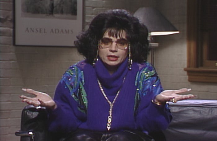 Without a doubt, Linda Richman, host of Coffee Talk, is the best character to ever come out of Saturday Night Live. And let's be honest — if you are any kind of parent, your child already knows the word "verklempt" and how to yell, "Talk amongst yourselves. Discuss." It's also a super easy costume to put together and everyone will be talking about it. You'll need a blue turtleneck, black shiny pleather pants, red nail polish, a long chain necklace, and a black wig that you can tease into submission. "Remember, the number is 555-4444. Call, we'll talk, no big whoop."