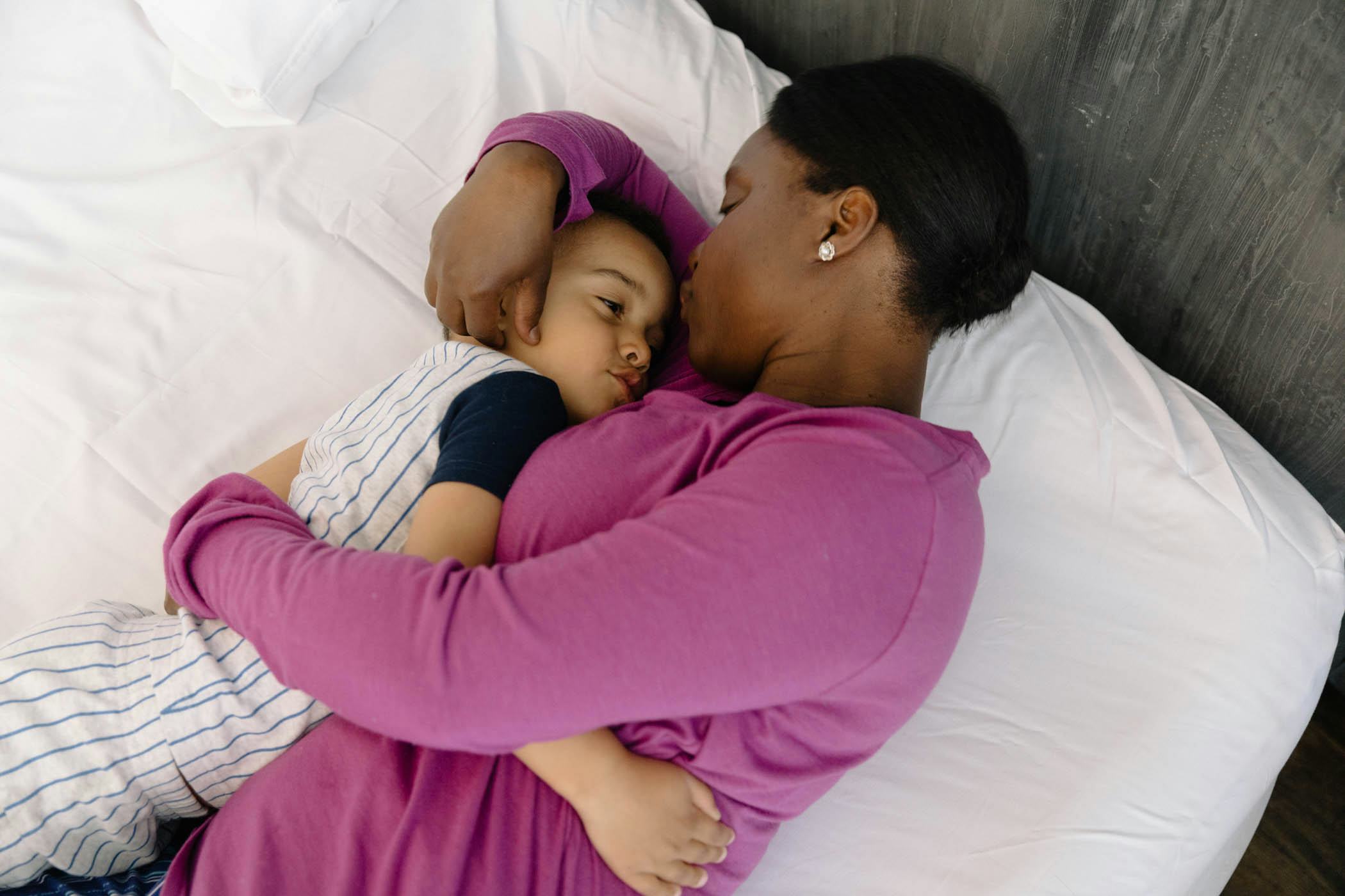 Snuggling in bed with your child to help her fall asleep works, and I know this from personal experience. There may be no place that feels more safe, secure, and relaxing for a child than in mom's arms. The key is to prevent yourself from falling asleep, too, in the few minutes it usually takes for your kid to get into deep slumber.