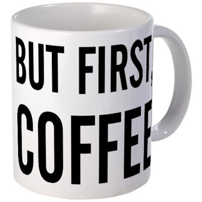 For the co-worker who must have three cups of coffee before being able to have a conversation, Cafe Press' But First, Coffee mug ($11) really gets the sentiment across.