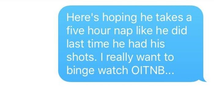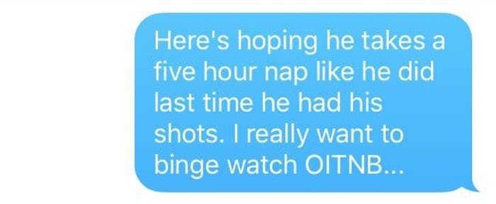 Above and beyond all that, of course: we're moms. We're about to give our baby needles. I mean, it's for their own good but still. We need to work through the anxiety with our best friends because, after all, what are best friends for? So, what are we going to wind up texting them? A lot of the following will probably look familiar to my fellow vaccinating mamas...