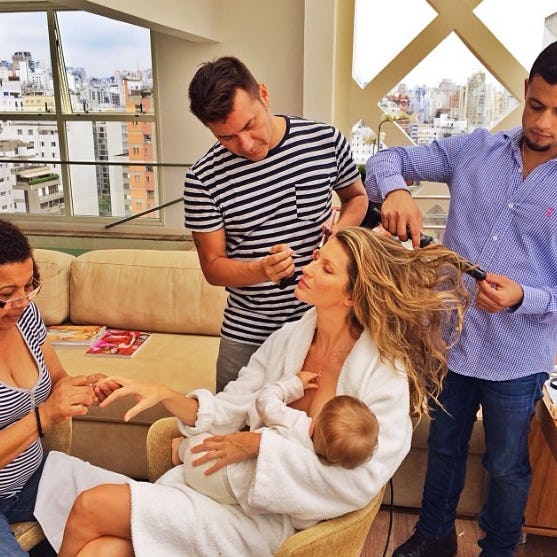 Gisele Bündchen, fashion model and mother of two, has been an outspoken advocate in favor of breastfeeding. In 2013 Bündchen posted an Instagram photo in which she's breastfeeding her 1-year-old baby while a team of beauty professionals help her get ready. How badass is that?