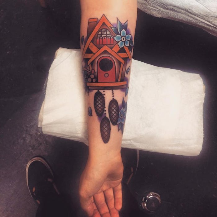 Remembering the days of when the cuckoo clock struck 12 at grandma's house, Colleen tried desperately to find a clock that replicated the one the backbone of her family had. Since she couldn't find one, she decided that a tattoo replica would be just as great.
