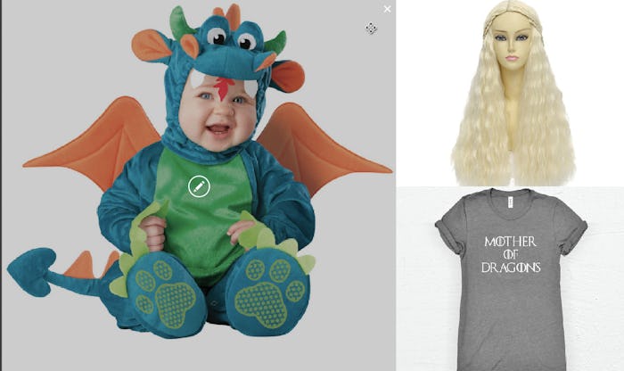 Mother of Dragons Shirt, $18, Etsy | Braided Blonde Wig, $16, Amazon | Infant Dragon Costume, $72, Halloween Express | Red Dragon Costume, $37, Amazon