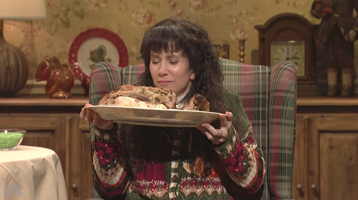 Okay, there are a lot of Thanksgiving jokes in the "that's what she said" genre. "Do you like the thighs?" "I don't have enough room for that," and, of course, "I'm so happy you came."