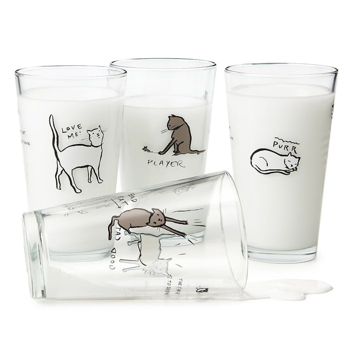 Patricia Carlin at Uncommon Goods created these cat Tao glasses (4 for $35) that express the dual nature of kitties. The set includes cute illustrations alongside quotes such as "Napping overcomes wrath."